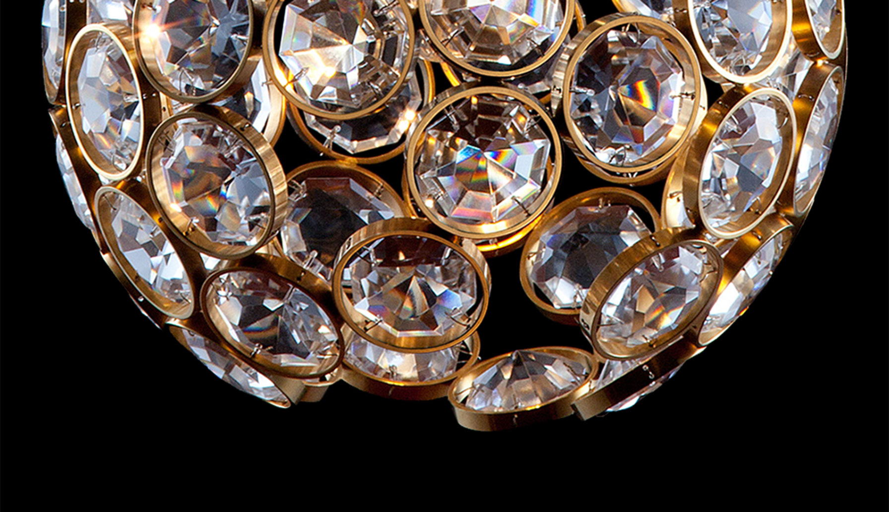 The constructive elements of Cunning are gilded brass rings, set with a large octagonal crystal. These rings are soldered together inside a mould to become the outer skin of the lamp frame. The octagon‘s pointy tips lie towards the inside to best pick up the light from there and bathe the surface in its magical sparkle.