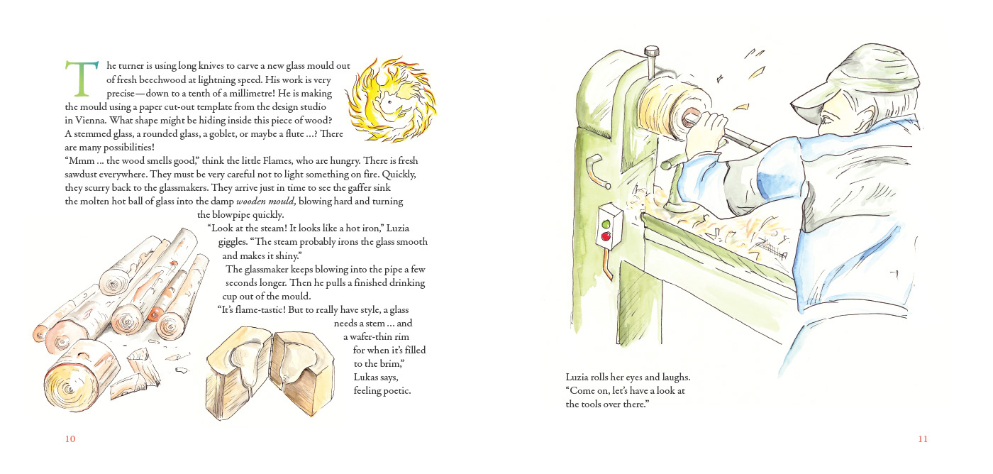 Children and adults who have always wanted to discover how hand-made glass is traditionally made can now learn about the wonderful process in this lovingly created picture book published by the centuries-old glass manufacturer Lobmeyr. The stars of the magical story are Luzia and Lukas, two little flames who live in the furnace of a Bohemian glassworks. Together with the readers, the two fiery siblings set out to explore first the foundry—where molten glass is masterfully shaped in several phases—then the finishing workshops to observe how the glasses are cut and engraved, and finally the time-honoured Lobmeyr shop in the centre of Vienna’s old town. You will not only discover interesting facts about an ancient craft, but also learn about the history of a traditional Viennese business that once supplied crystal to the imperial court and turned 200 years old in 2023.