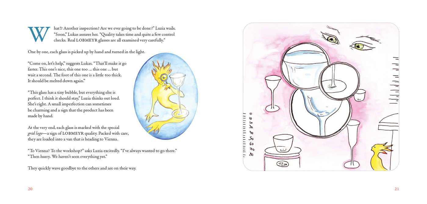 “We didn’t want to make a dry presentation folder or yet another flashy production video to introduce people to the secrets of glassmaking,” explains Lobmeyr owner Leonid Rath. Leonid’s sister and artist Louise Rath contributed her charming and informative illustrations, while the story is from the pen of children’s book author Isabella Diessl. Rich in metaphors, this tale of glassmaking is just as interesting and instructive for adult readers as it is for young ones.